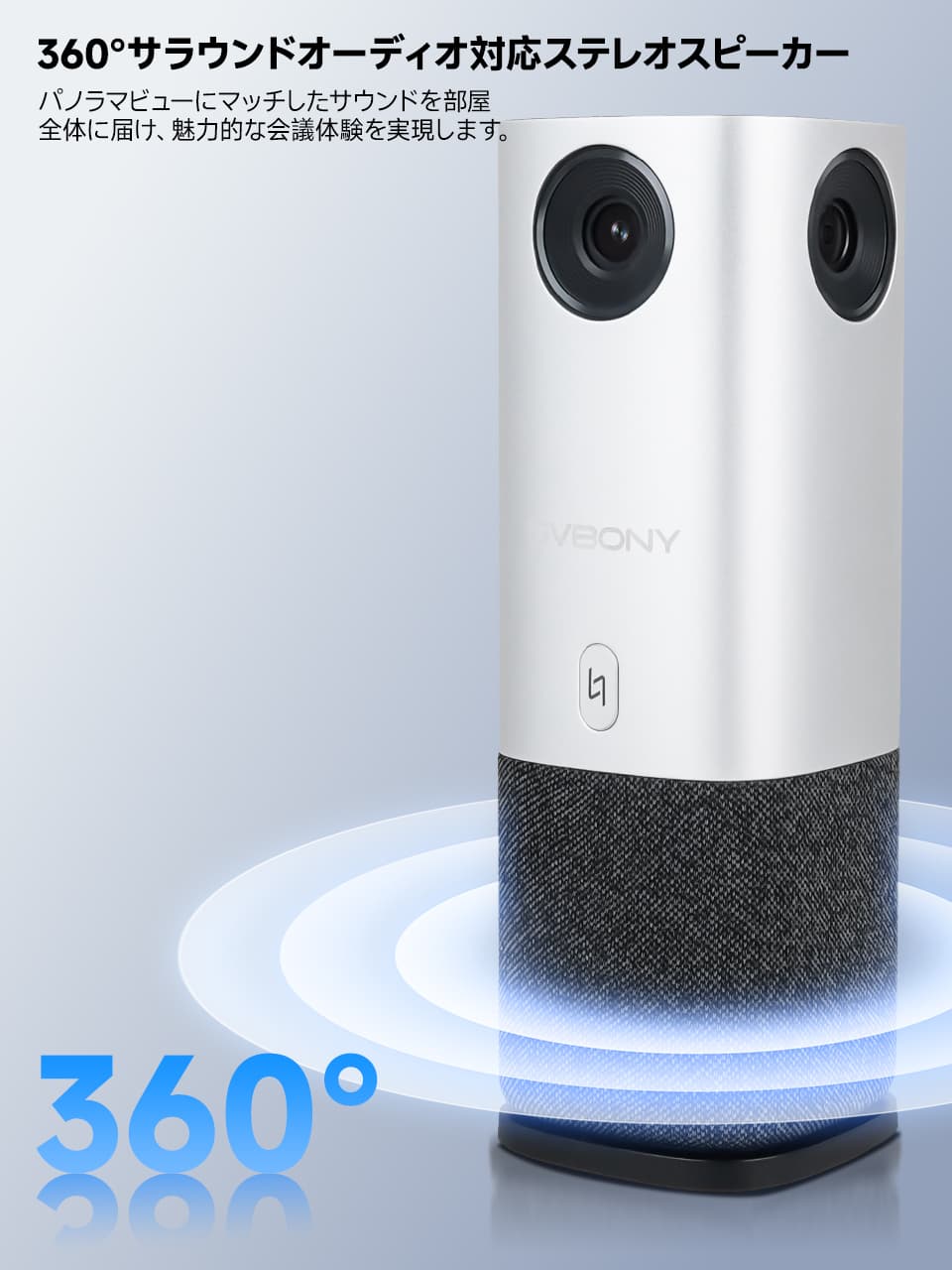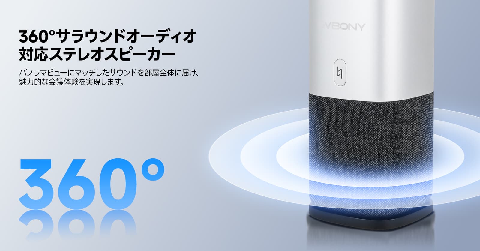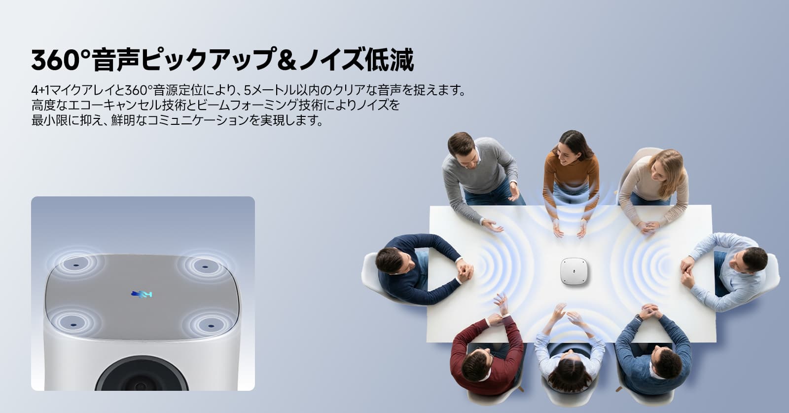 4+1マイクアレイが5m範囲の音声を360°集音。エコーキャンセリングとステレオスピーカーによる臨場感あふれるサラウンドサウンドを提供します。