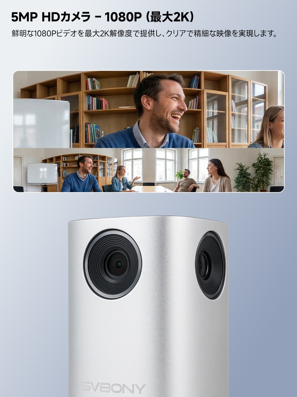 スピーカー・マイク・5MP HDカメラを一体化し、配線の煩雑さを解消。2K/1080Pの高画質と音声映像の完全同期で、クリアな会議を実現します。