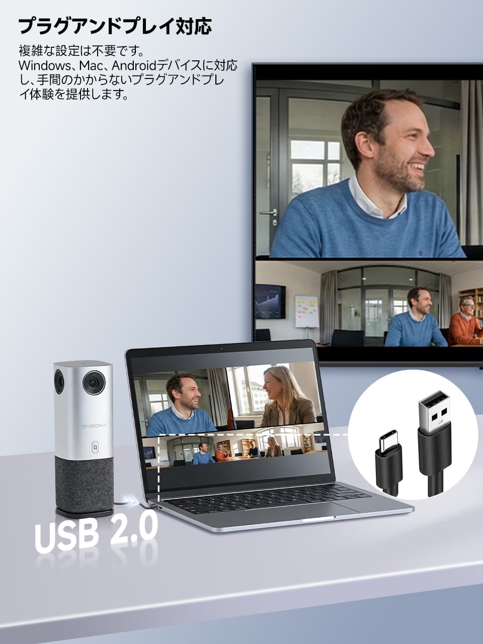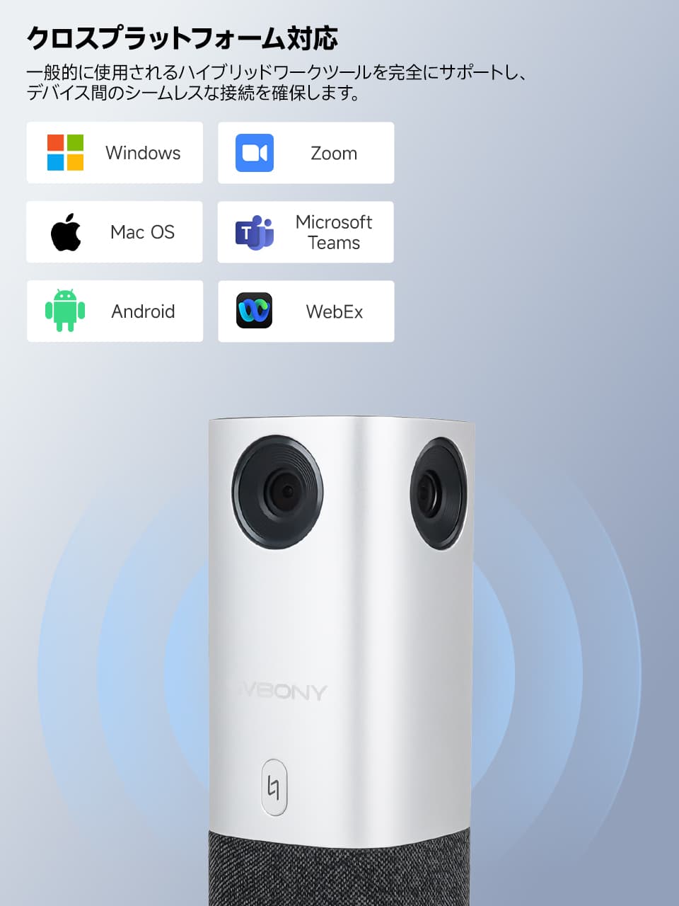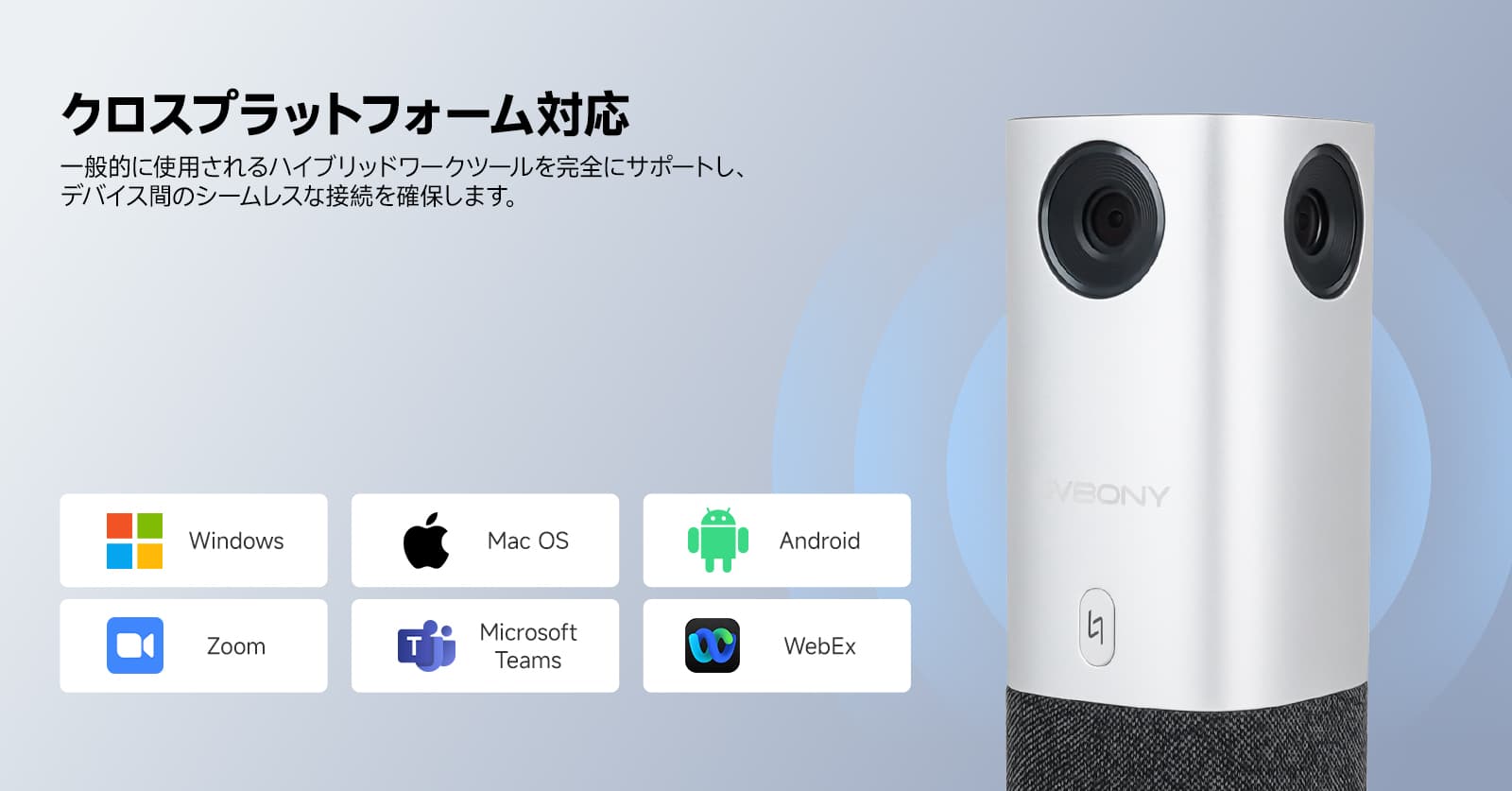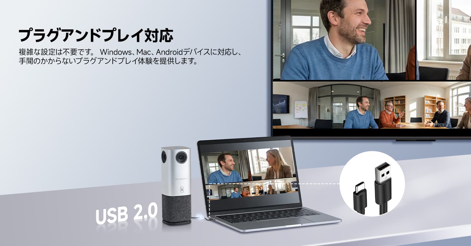 USBプラグアンドプレイ対応で設定不要。Windows/Mac/AndroidやZoom/Teams/WebEx等の主要プラットフォームでシームレスに使用可能です。