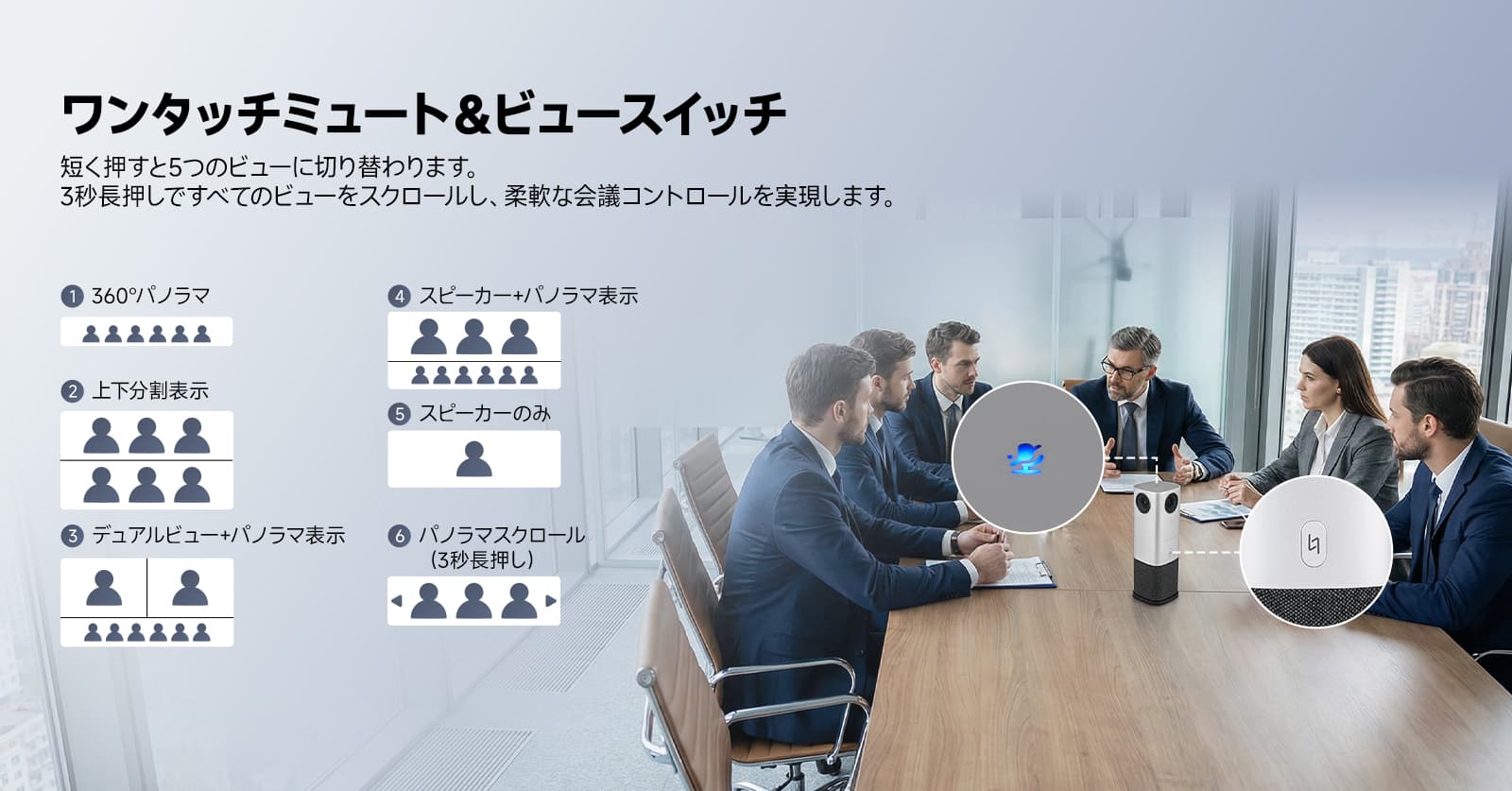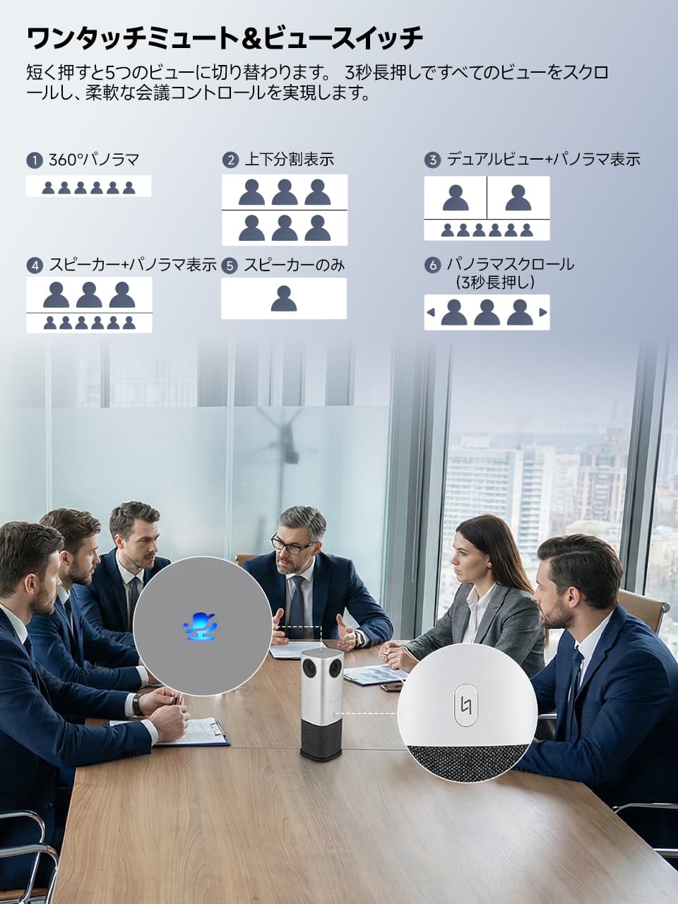 ワンタッチでミュート/ビューモード切替(パノラマ・クローズアップ等)。専用アプリからも遠隔操作可能で、自動顔認識や画像最適化もスマートに行えます。