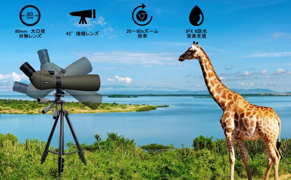 360度調整出来ます。仰ぎ見る/水平角に見る/俯き見る、どんな姿勢でも観察できます。ロックネジ緩めれば、自由に観察角度を調整することできます。 傾斜型フィールドスコープ、軽くて対象物を捕捉しやすい、操作性にも優れ、接眼部が45度、上向きに傾斜したコンパクトなフィールドスコープです。14.5mm〜11.5mmのアイレリーフ