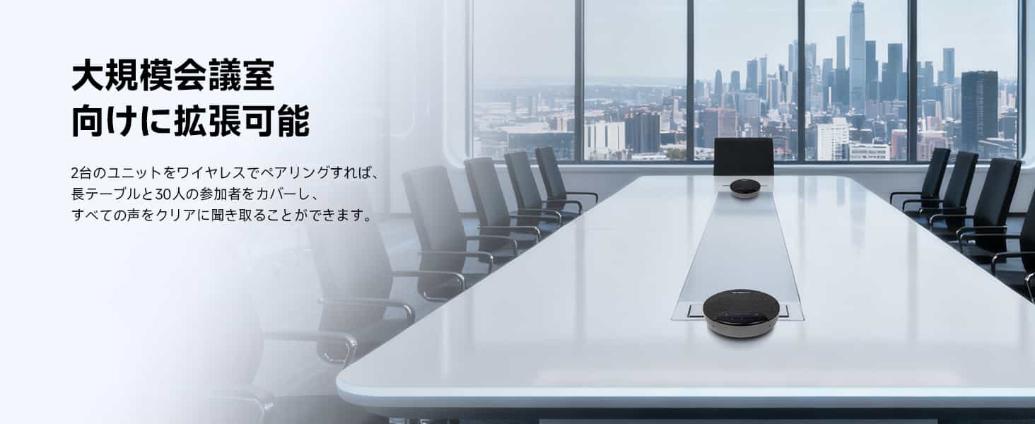 ワイヤレス5.0、USB 2.0、ドングル接続をサポートし、約11m(36フィート)の安定した通信が可能。Zoom、Teams等の主要プラットフォームと幅広く互換し、個人から中規模会議まで多様なシーンに対応します。